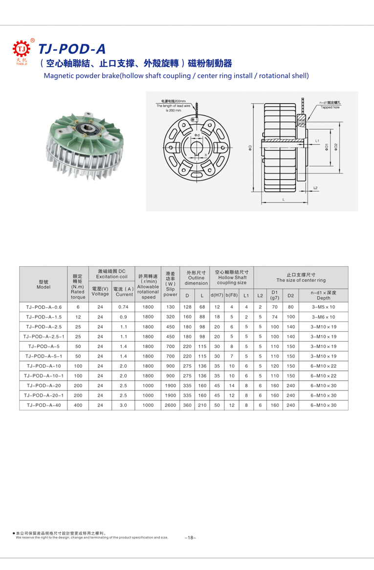 東莞天機傳動生產(chǎn)廠家制造的中空軸磁粉剎車器又稱外殼旋轉磁粉剎車器;中空軸磁粉剎車器熱容量很大:由于使用了耐熱性優(yōu)的磁粉及運用了理想的冷卻方法。即使是過于嚴酷的連續(xù)滑動運轉,采用的是DC24V直流安全電壓,也可以安心使用。外殼旋轉磁粉剎車器型號有:TJ-POD-A-0.6、TJ-POD-A-1.5、TJ-POD-A-2.5、TJ-POD-A-5、TJ-POD-A-10、TJ-POD-A-20、TJ-POD-A-40等更大的磁粉剎車器;
